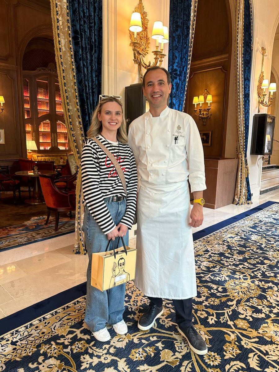 После посещения кондитерской Ritz Le Comptoir мы с подругой пошли посмотреть другую витрину — в зоне ресторана. И совершенно неожиданно встретили самого шефа Франсуа Перре. Завязался разговор (ну как… я сразу забыла весь английский 🤦♀️), сфоткались (на фото видно, как Кира просто светится от счастья 😂). Шеф спросил, откуда мы и где работаем, а так же рассказал о своих новых десертах. А мы как раз удачно попали в тот момент, когда он выставлял их на витрину 😍
