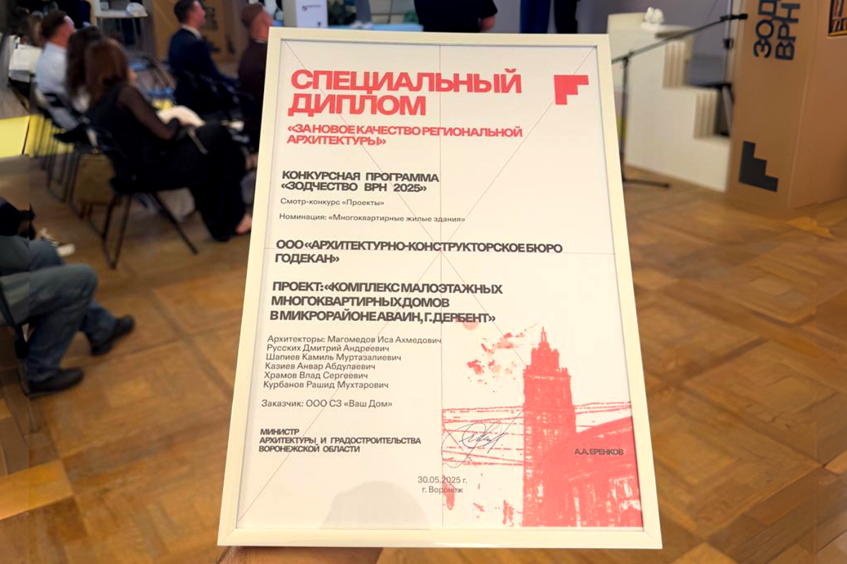 Проект жилого комплекса, над которым работает бюро Godekan, отмечен специальным дипломом на архитектурном форуме Зодчество ВРН. Форум ежегодно проводится с 2007 года и является крупнейшей площадкой в Центральной России для архитекторов, представителей власти и исследователей. Этот проект отличает цельность подхода — когда и материал, и форма, и среда создают узнаваемое пространство, в котором ощущение дома создается не только благодаря эмоциям и связи с прошлым, но еще и через логику – инструменты, потребности и сценарии.