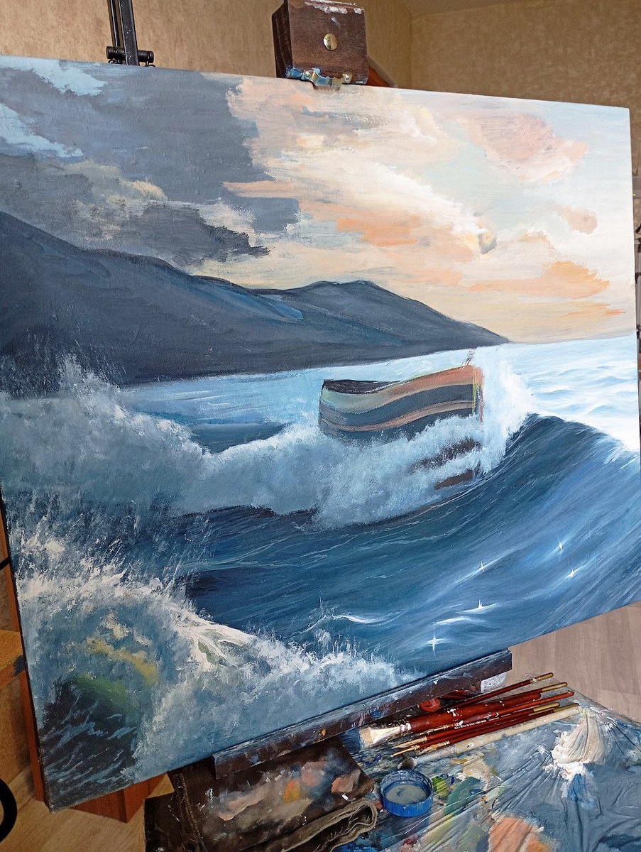 Вот ещё одно незаконченное полотно с морем. Думал, будет проще, а оно тяжело идёт, не факт, что закончу.