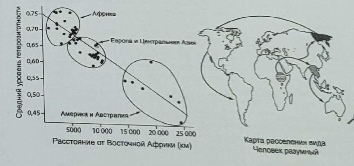 Задание с реального ЕГЭ-2025 Средний уровень гетерозиготности отражает долю генов, которые находятся в гетерозиготном состоянии для данной популяции. Известно, что средний уровень гетерозиготности у европейцев существенно ниже, чем у коренных жителей Африки. Какой эволюционный фактор привел к такому распределению гетерозиготности? Ответ поясните. Почему самые низкие значения гетерозиготности характерны для коренных американцев? При сравнении коренных американских и австралийских популяций они оказываются гомозиготны по разным генам. Как можно объяснить наблюдаемую закономерность? 1) Дрейф генов (эффект основателя, сериальный эффект основателя) 2) Люди мигрировали на новые территории небольшими группами 3) В небольших группах не было представлено всё разнообразие аллелей материнской (исходной) популяции (была низкая гетерозиготность) ИЛИ 3) При миграции сохранялись не все аллели материнской популяции 4) Америку последовательно заселили позже вего ИЛИ 4) Популяция, мигрировавшая в Амер