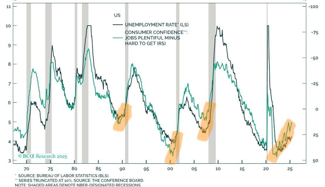 В ответ на пост Наглядное изображение мыслей коллеги Рынок труда [уровень безработицы + настроения потребителей] планомерно остывает каждый раз переход входом в рецессию и началом фазы дефляции активов @marketheart
