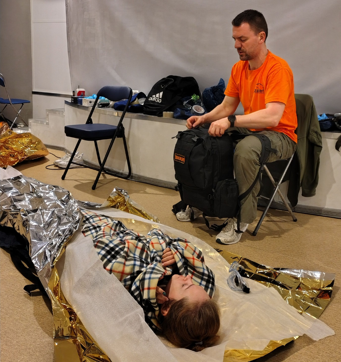– Всем привет! Я Далми. А почему вы без рулонов изолона? – Привет! Потому что я второй инструктор. Катя, Псай. Все дружно посмеялись и продолжили ждать Николая (Ник Ника), старшего направления первой помощи и эвакуации «ЛизаАлерт» Питер. Несколько дней назад он скинул список того, что необходимо купить для первичного базового занятия по эвакуации, и в нём был двухмиллиметровый изолон, который мы дружно искали по всем магазинам. Подъехал НикНик с кучей вещей и рюкзаков, ловко взял это всё, поздоровался с нами и понёс в здание, мы побежали за ним. На первой части занятия Николай рассказывал, как действовать в разных случаях, какие бывают ситуации, что мы имеем право делать, а что нет. Мы много слушали, рассуждали и обсуждали, потом НикНик предложил это всё попробовать на практике – оказалось сложнее и интереснее, чем мы думали. Найти человека – это только половина дела. Надо проверить, есть ли у него травмы, аккуратно переместить в согревающий «бутерброд» из пледа, спасодеяла и изолона,