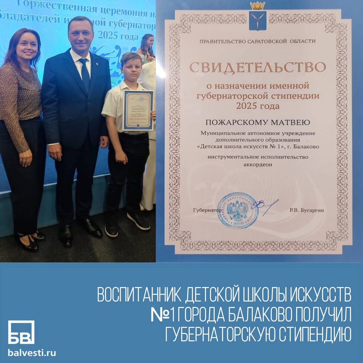 В Саратове прошла торжественная церемония вручения Губернаторских стипендий одаренным детям. Одним из награжденных стал ученик отделения народных инструментов Детской школы искусств №1 города Балаково Матвей Пожарский (преподаватель Н.Г. Зубарева). Всего лауреатами стали 75 талантливых школьников и студентов Саратовской области. Это музыканты, художники, вокалисты, начинающие актеры и танцоры. Заслуженную награду они получили за успехи в учебе и высокие творческие достижения. Губернатор Саратовской области Роман Бусаргин во время награждения отметил, что стипендия - это еще одно признание результатов ребят, их огромного труда, целеустремленности и желания делать мир лучше благодаря творчеству. Традиционным дополнительным подарком для стипендиатов станет туристическая поездка в Москву в дни осенних каникул. По информации Детской школы искусств №1 города Балаково