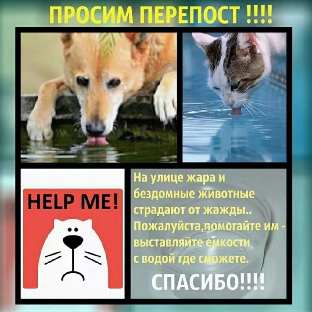 НАЛЕЙ ВОДЫ БЕЗДОМНОМУ ЖИВОТНОМУ!!! Аномальное жаркое лето становится страшным испытанием для бездомных животных. Бездомные собаки и кошки оказались в ужасной ситуации, из-за жары везде пересохли лужи, попить совершенно негде. Домашним собакам тоже нелегко переносить жару, но у них хотя бы есть хозяева, которые стараются максимально облегчить жизнь питомцев! Купание, создание тени в месте отдыха, летняя стрижка собаки или кошки, обеспечение постоянного доступа к свежей прохладной воде - все это стараются обеспечить заботливые владельцы своим питомцам, и всего этого лишены бездомные животные! Еще хуже ситуация для птиц. Городские голуби, вороны, воробушки массово умирают от жажды. Сложнее всего найти питьевую водичку птицам, так как они не улетают в поисках речки или озера из дворов, к которым привыкли, а особенно, если они находят в этих дворах вдоволь еды. Единственное место, где сейчас могут попить птицы - вода, капающая с кондиционеров, но ее настолько мало, что нормально утолить