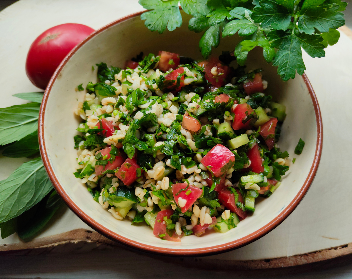Табуле (ударение на второй слог) - замечательное блюдо ближневосточной кухни, популярное в Сирии, Ливии, Иране, Пакистане. В переводе с арабского "пикантный". Блюдо абсолютно постное, вегетарианское. Основные ингредиенты: крупа булгур, овощи и свежая зелень. На мой взгляд, табуле заслуживает внимания, так как готовится очень быстро и просто, из самых простых ингредиентов и идеально подходит на гарнир к шашлыку: Ещё один весомый плюс - рецепт очень вариативный и легко подстраивается под любой вкус. - булгур (можно заменить на кускус) 1/2 стакана сухой крупы 100 г - огурец 1 шт. - помидор 1 шт. - петрушка большой пучок - лук зелёный пучок - мята несколько веточек - сок 1/3 лайма или лимона - оливковое масло 3 ст.ложки - соль, перец по вкусу ☝️Это базовый рецепт. Количество ингредиентов можно регулировать на свой вкус: того, что любите, берите побольше, что не нравится - поменьше. Огурец и помидор являются необязательными. Вместо зелёного лука допускается салатный красный, но с зелё