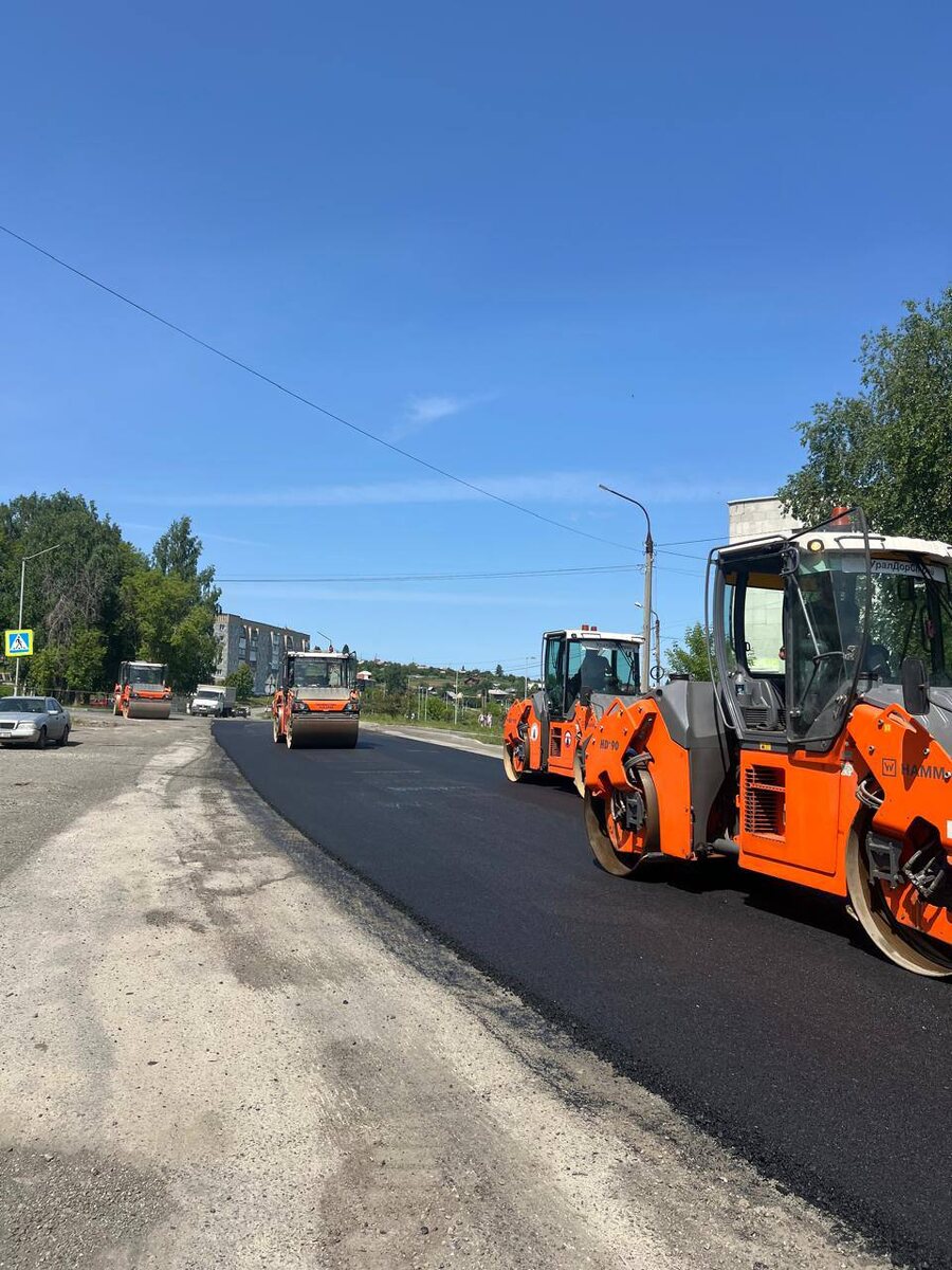 Активно идет укладка первого слоя асфальта на дороге по ул.Ленина. На месте работают два асфальтоукладчика, четыре дорожных катка.