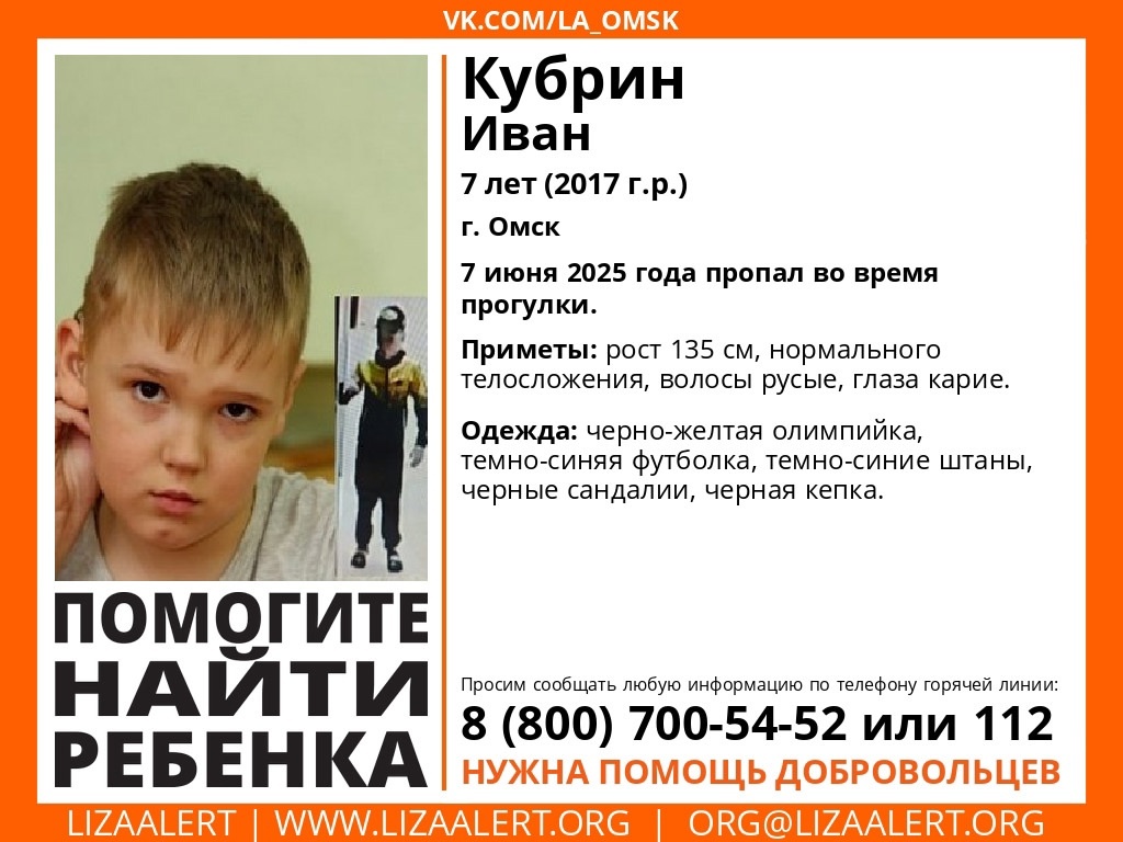 Мальчик вышел из дома и не вернулся. В Омске разыскивают 7-летнего Ивана Кубрина, который пропал во время прогулки в субботу, 7 июня. Как сообщили в поисковом отряде «ЛизаАлерт», мальчик вышел на улицу и не вернулся домой. С тех пор его местонахождение остается неизвестным. Приметы мальчика: рост 135 см, телосложение нормальное, волосы русые, глаза карие. Он был одет в черно-желтую олимпийку, темно-синюю футболку, темно-синие штаны, черные сандалии и черную кепку. Всех, кто обладает какой-либо информацией о его местонахождении, просят немедленно сообщить по телефонам горячей линии: 8 (800) 700-54-52 или 112. Алексей Новиков