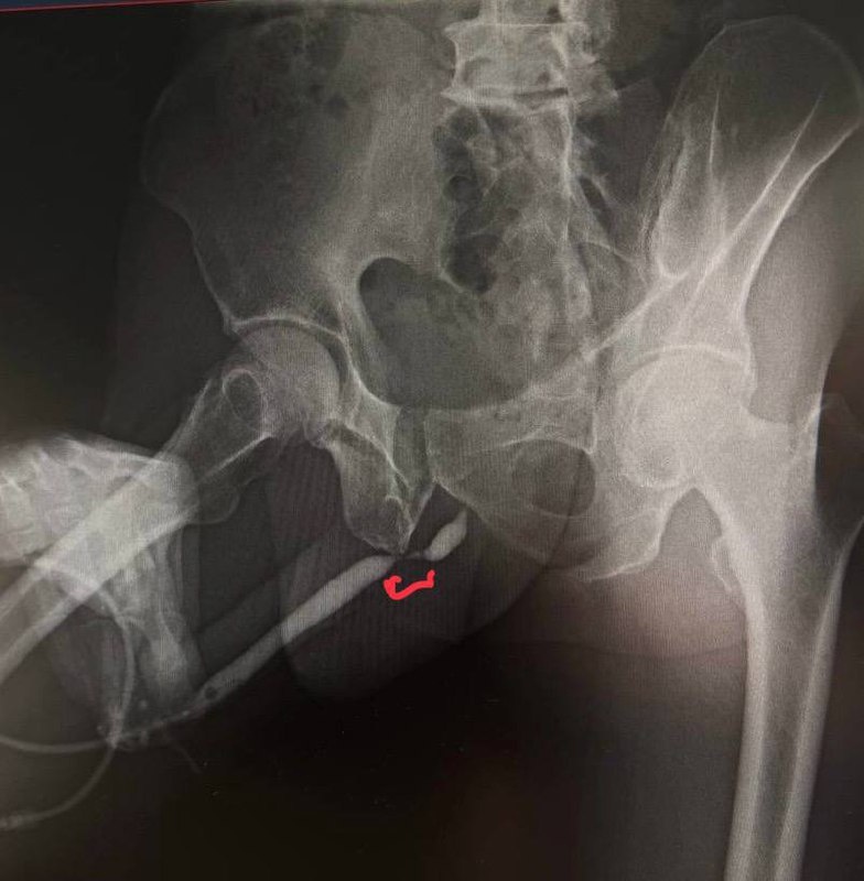 М, 70 Анамнез: 3 года назад перелом полового члена при половом акте с последующим прогрессирующим ухудшением качества мочеиспускания. По материалам обследования: Урофлоуметрия -> Qmax 2.1. УЗИ мочевого пузыря -> 180мл остаточной мочи. Ретроградная уретрография представлена на фото. По урологическому профилю ранее не наблюдался. УЗИ предстательной железы - 42 см3. МИЭФ-5 - 18 баллов. Обрезания не было. Клинический случай на обсуждение от @Mikhaildoctor ☝️ Какая оптимальная хирургическая тактика ? Контакт для связи и публикаций своих материалов - @Aleksei_Mk02