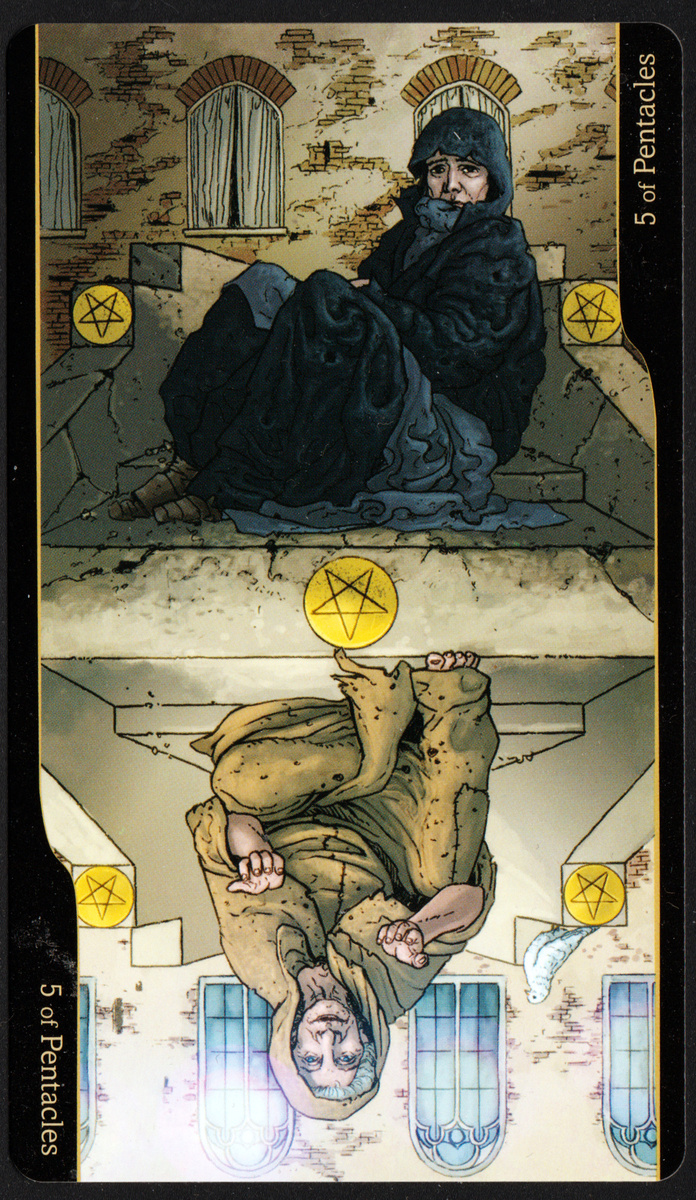 При более внимательном рассмотрении пожилой женщины на верхнем изображении, которое освещено, на мой взгляд, у нее очень достойный вид; в этом изображении присутствует Голубь мира, сидящий неподалеку, и эта фигура имеет черты императрицы, несмотря на поношенную одежду; Но изображение в нижней, более темной части карты кажется мне призрачным и потерянным, Голубь улетел, а шторы в здании позади нее закрыты, она закрыта, она выглядит так, как будто чувствует себя закрытой, исключенной, отвергнутой; и мое сокращенное значение для 5 пентаклей - это холод и исключение.