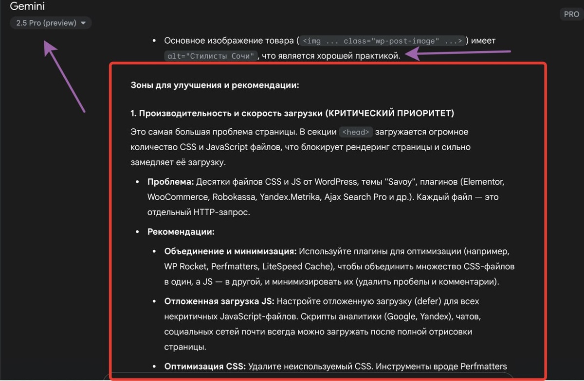 Идея вам для бизнеса - берете ИИ (топовую от Google), берете html - код страницы сайта (например, товарную), кидаете ИИ и получаете детальный разбор по SEO и юзабилити. Продаете :) клиентам. Ну вот я попробовал на примере companylist.ru и даже удивился качеству анализа и выводам. У нас там WordPress и не все легко поправить, но для сайтов, сделанных с нуля - вполне себе руководство к действию. Отмечу, что я юзал именно последнюю версию Гемини. Не благодарите :) Русский ИТ бизнес