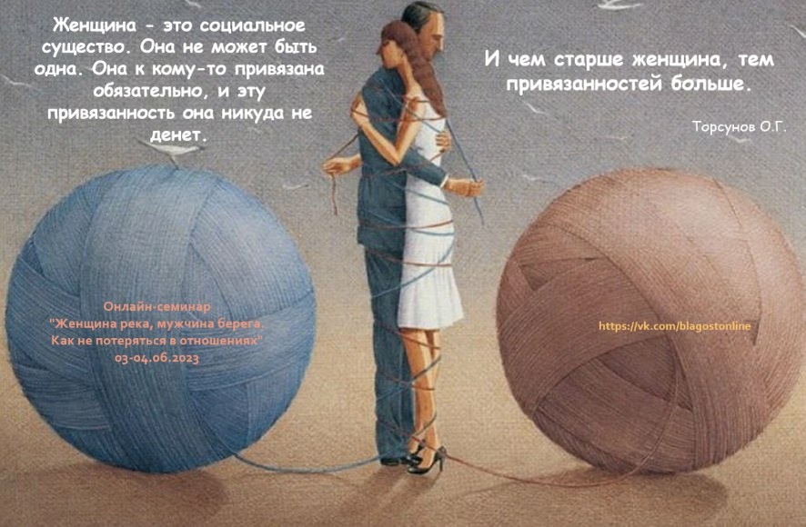 Женщина - это социальное существо. Она не может быть одна. Она к кому-то привязана обязательно, и эту привязанность она никуда не денет. И чем старше женщина, тем привязанностей больше. ✅ Олег Геннадьевич Торсунов, из онлайн-семинара «Женщина река, мужчина берега. Как не потеряться в отношениях», 03-04.06.2023