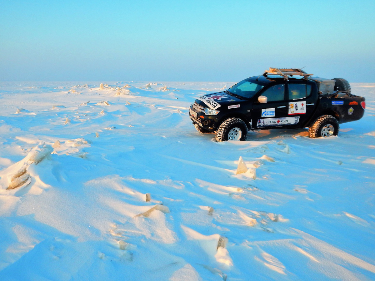 Но, каким бы гостеприимным не был Ямбург, нужно было ехать дальше. Через льды Обской губы на другую её сторону – на полуостров Ямал. Правда, нам все говорили, чтобы мы даже не пытались этого делать. Потому что буквально за два дня до нас здесь была какая-то большая экспедиция на Лендроверах. И что даже они не смогли переехать Обскую губу, развернулись и уехали по асфальту назад, потому что зимник перемело. А уж нам-то, да ещё и в одну машину, и подавно нечего туда соваться. Так что нам пришлось клятвенно пообещать, что раз зимник перемело, то мы тогда по нему и не поедем.