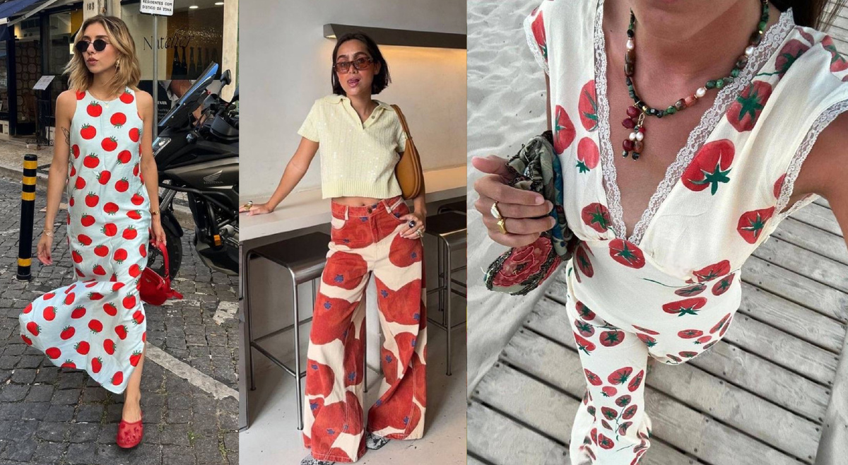 Помидорный принт набирает обороты в летнем сезоне 2025 года не только среди дачников, но и мировых модников, которые превратили его в яркий и оригинальный элемент гардероба. Такой яркий принт — отличный способ добавить летнего настроения и лёгкой иронии в повседневные образы. Предлагаю рассмотреть стильные примеры с помидорным принтом и узнать, с чем лучше всего его сочетать. А подборку помидорных вещей с ссылками делала в этом и этом постах своего телеграм-канала. Кстати, напишите в комментариях, с чем у вас ассоциируется помидорка? С бабушкиным огородом или с гаспачо, сальсой и «кровавой Мэри»? Первый образ — платье в полный рост с крупным принтом на белом фоне. Лаконичный фасон и минималистичный крой делают этот образ универсальным. Красные аксессуары — сумка и обувь — идеально подчеркивают основной цвет принта, создавая гармоничный и стильный лук для прогулок по городу или летних вечеринок. Второй комплект — трикотажный топ и длинная юбка с помидорным рисунком, выполненные в одной