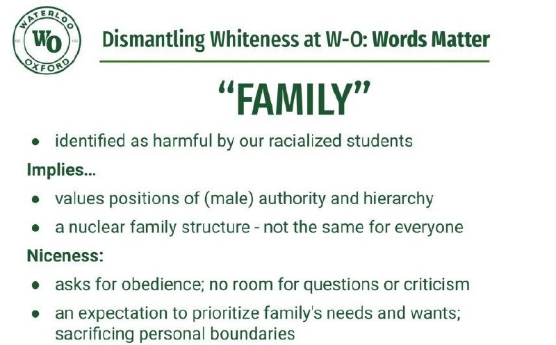 Канадским школьникам рассказывают, что термин «семья» — вредный и расистский. В новых учебных материалах утверждается, что слово «семья» может быть оскорбительным, поскольку ассоциируется с мужским доминированием, подавлением личных границ и приоритетом семейных нужд над индивидуальными. Также отмечается, что такие понятия, как «перфекционизм», «патернализм» и «право на комфорт», считаются характеристиками «белизны» и способствуют поддержанию белого превосходства.