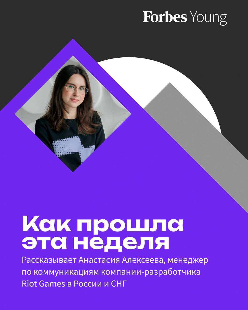 Сегодня в рубрике «Как прошла эта неделя» о своей жизни рассказывает 29-летняя менеджер по коммуникациям Riot Games в России и СНГ Анастасия Алексеева. Как прошла твоя неделя? Успела сходить на концерт, одним днем съездить в другой город к подруге на девичник, еще поработать за двоих, потому что коллега ушел в отпуск, переделать кучу домашних дел и отвести душу на тренировке по верховой езде. Чем ты занимаешься? Сейчас я менеджер по коммуникациям, но это не описывает всего, что мне приходится и приходилось делать по работе. По факту, я SMM, коммьюнити- и инфлюенсер-менеджер, еще PR, креативщик, продюсер и на совсем чуть-чуть — графический дизайнер. Что самое крутое в твоей профессии? Работать с тем, что искренне любишь. Я геймер со стажем, видеоигры являются одним из основных столпов моей личности. У меня даже оба диплома написаны по киберспортивным трансляциям :) Уже больше шести лет на моих глазах происходят буквально исторические — очень важные для индустрии события, и быть
