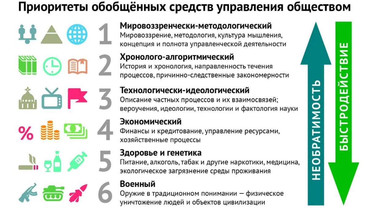 В интернете есть много материалов по шести приоритетам обобщённых средств управления, это одна из тем, которая, на мой взгляд формирует системное мышление и влияет на меру понимания многих событий в мире. В этой статье подготовил задания для базового практического освоения данной темы. Освоить базу: "Если вы не найдете способ зарабатывать деньги, пока спите, вы будете работать, пока не умрете". Уоррен Баффет Осваивай базу: По скорости воздействия этот приоритет стоит на первом месте, а по влиянию на мировоззрение - на последнем. Философия жизни, мировоззрение формируется годами - в масштабе отдельной страны около 25 лет на поколение. Вряд ли получится переубедить в чем-либо другого человека, нацеливая на него оружие. Поэтому его используют для других целей и, как правило, применяют в последнюю очередь, когда все остальные инструменты воздействия не дают желаемых результатов. Приглашаю в свой ТГ канал: @alexeev_team