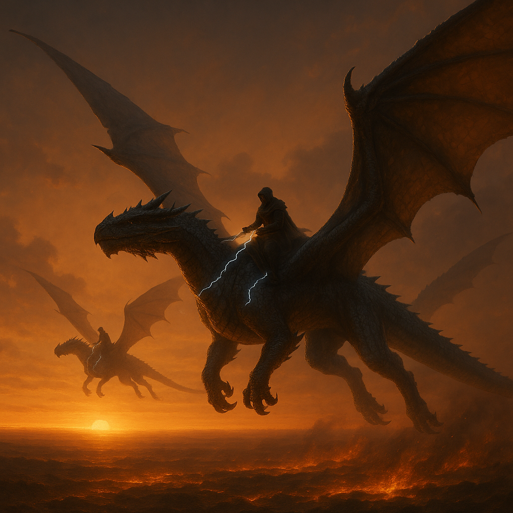 В начале времён, когда земля ещё дышала жаром своего рождения, а звёзды сияли, как искры над кузницей богов, небо не знало лёгких крыльев птиц. Его рассекали драконы — стражи вечности, чьи чешуйчатые тела отражали первый свет мира, а дыхание вплетало в ветра эхо первозданного огня. На их спинах, в седлах, выкованных из бурь и молний, восседали Всадники Первого Пламени. Они не учились магии — она текла в их венах, как река в русле, рождённая от прикосновения к драконьей чешуе. Их союз был не узами дружбы и не цепями власти, но нитью судьбы, сплетённой в горниле жизни и смерти, где всадник шептал имя своего дракона, а дракон хранил его путь, как звезда хранит свой свет. Драконы, гласит предание, не были детьми земли. Они явились в миг, когда мир ещё клокотал в хаосе, их сердца — чаши, где горело Первое Пламя, сила, что могла разорвать небеса или усыпить море. Это пламя, бесформенное, но властное, было заключено в печать — серебряную пластину, чьи руны пели о вечности, сияя даже в ночи бе