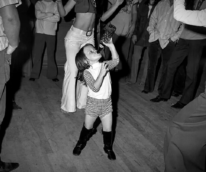 Эта история про странную вечеринку во Флориде. И сейчас вы всё сами увидите! В конце вас ждет самое интересное, поверьте. Маленькая девочка в клетчатом платьице стоит посередине круга взрослых и лихорадочно тянет вверх бутылку с сомнительным содержимым. Это вообще нормально? Вокруг неё стоят взрослые и смотрят на эту картину, как будто бы так и должно быть. Фотография передает атмосферу той эпохи, когда отношение к детскому воспитанию было, скажем так, более свободным. Интересно, что думали её родители, глядя на эту живописную картину? Два приятеля позируют на камеру с видом настоящих бунтарей. Младший парень слева выглядит взрослее своих лет. Но по фото видно, что ему точно меньше 18 лет. Оба одеты в джинсовые куртки, олицетворяющие стиль того времени. Младший явно копирует поведение старших ребят. Классическая картина подростковой дружбы – когда младшие тянутся к старшим, а те с удовольствием играют роль наставников. Девушка в окружении четырех парней. Сразу видно, что мужского вни