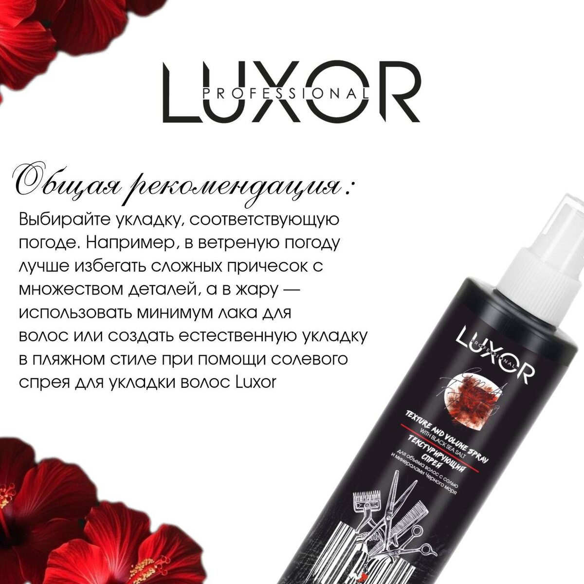 Первая половина лета — сезон отпусков для всех и время активной работы для мастеров по волосам. Ведь именно в этот период проводятся выпускные и последние звонки, а значит, наступает время причесок, кудрей, начесов. И если какую прическу выбрать, клиент знает сам, то как сохранить укладку до конца вечера в непостоянную летнюю погоду – зона ответственности мастера. Сегодня мы поделимся советами, как сохранить прическу в разных погодных условиях. 📌 Совет 1: Независимо от погоды используйте термозащитные средства, чтобы минимизировать негативное воздействие высоких температур, а также продукты с SPF. Обратите внимание на Термозащитный спрей для волос Luxor Professional. Он предназначен для защиты волос от воздействия высоких температур при укладке. Идеально подходит для использования с фенами, плойками и щипцами для завивки волос. Фитополимер в составе формулы создаёт защитный слой и препятствует повреждению кутикулы. Экстракт каштана и сок алоэ в составе увлажняют и придают воло