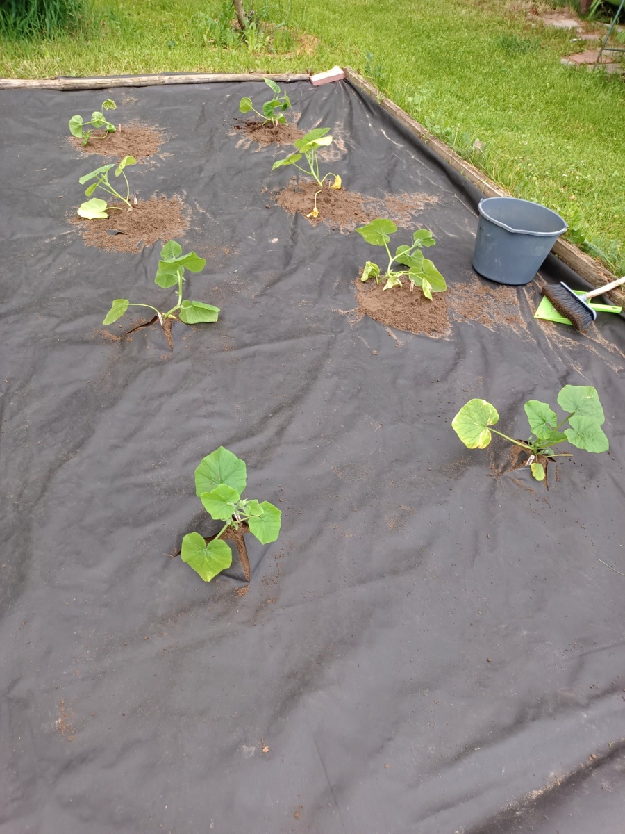 🎃 Высадил тыкву. Тут у меня, парно: ✔️Orange Sun, до 1.5кг; ✔️Стофунтовая, до 20кг; ✔️Бин Мун, до 50кг; ✔️Медовая Крошка, до 4кг. Расстояние между лунками по 80см. Понимаю, что нужно метр на два метра, но это слишком. Голосемянку, и noname высадку проведу в другие места, поштучно. Землю, что из лунок вылезла, убираю веником и совком. Понимаю, это типа лишнее, но так будет красивее. Теперь сюда кукурузу нужно, по периметру.