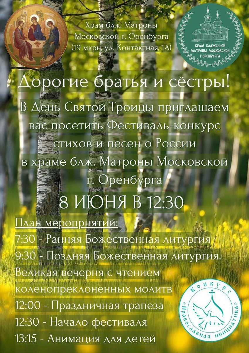 🍃Дорогие братья и сёстры! 🍃 Приглашаем вас и ваших детей на мероприятия, посвященные Дню Святой Троицы и наступающему Дню России, при храме блж. Матроны Московской г. Оренбурга!🇷🇺 В программе мероприятий: ✅7:30 - Ранняя Божественная литургия ✅9:30 - Поздняя Божественная литургия. Великая вечерня с чтением коленопреклоненных молитв ✅12:00 - Праздничная трапеза ✅12:30 - Фестиваль-конкурс стихов и песен о России ✅13:15 - Анимация для детей от РУССКОЙ ОБЩИНЫ ОРЕНБУРГ Почетные гости фестиваля - Мужской хор Оренбургской епархии 👏 Мероприятия организованы при поддержке Международного грантового конкурса "Православная инициатива - 2025". Приглашаем всех на богослужения и праздничные мероприятия!