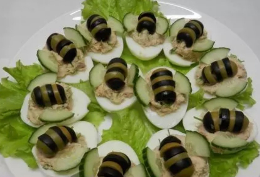 Яйца отварить, остудить и почистить. Разрезать пополам, вытащить желтки и размять их вилкой. Добавить тунец консервированный без жидкости, мелкопорезанный зелёный лук, соль, перец по вкусу, 1-2 ч.л. майонеза и всё хорошо перемешать. Наполнить получившейся массой половинки белка и украсить по желанию маслинами, оливками и огурцами. Всем мира, добра, красоты!