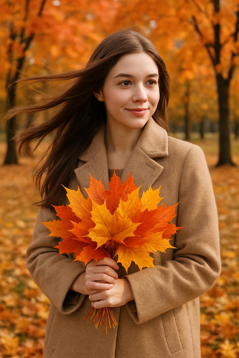 — У меня есть фото. На нём — она. Стоит с букетом кленовых листьев. Улыбается так, будто знает, что сейчас произойдёт волшебство. А я хочу, чтобы оно произошло. Чтобы это была не просто осень, а — её королевство. 📸 На фото — девушка в тёплом пальто, будто сама часть пейзажа. В её руках — огонь из листьев. Позади — парк, горящий золотом. А ветер играет её волосами, как будто тоже участвует в замысле. 🧡 Он сказал: — Она всегда говорит, что осень — её любимое время. Что в воздухе что-то затаённое, как будто за углом стоит чудо и просто ждёт сигнала. Я хочу, чтобы у неё была картина, где это чудо — уже случилось. 🎨 На картине: