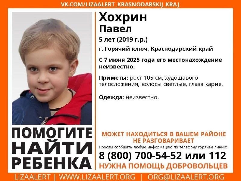 Внимание! #Пропал #Хохрин Павел, 5 лет (2019 г.р.), г. #Горячий ключ, #Краснодарский край С 7 июня 2025 года его местонахождение неизвестно. Приметы: рост 105 см, худощавого телосложения, волосы светлые, глаза карие. Был одет: неизвестно. НЕ РАЗГОВАРИВАЕТ!! ___ Инфорг: Инфорг: Лиляна (Сербия) 8918 6680428, Ольга (Умка) 8961 5999269 Горячая линия отряда: 8 800 700 5452 (звонок бесплатный)