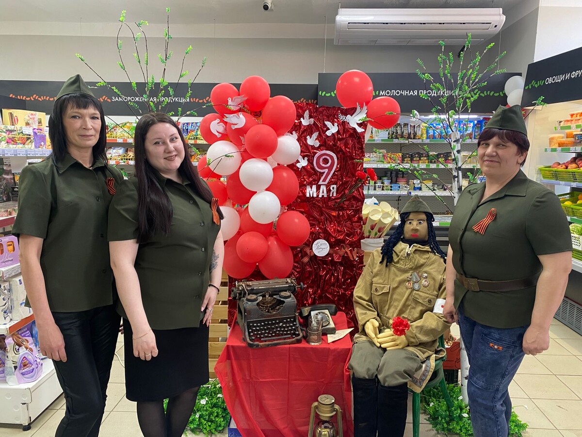 Вот такой дружной компанией работники магазина приняли участие в конкурсе, объявленном Свердловским облпотребсоюзом, в номинации "Сфера розничной торговли по оформлению магазина к 80- летию великой Победы". Подготовка заняла три недели. Фасад магазина украшен лентой из воздушных шаров, стендом - композицией с изображением юбилейной медали и поздравлением. На окнах между караваном белоснежных журавлей (рисовала Юлия Зырянова) - "Бессмертный полк" - портреты ветеранов, предоставленные Манчажским детсадом. На стене тамбура размещены черно - белые фотографии военных лет, мини - выставка предметов старины: походные чемоданы, керосиновая лампа, самовар, часы (предоставил постоянный покупатель Е. Н. Лукьянов). Дверь обрамлена кумачовой тканью, по которой парят бумажные голуби. В самом магазине размещена фотозона: ростовая кукла - медсестра в военной гимнастерке (смастерила Н. С. Зырянова), столик с печатной машинкой, телефоном и треугольниками писем. Также в магазине была оформлена выставка детских рисунков. Юные художники, воспитанники детсадов с. Манчаж и д. Токари, под руководством своих воспитателей А. А. Изгагиной, Е. В. Шаяхметовой, М. И. Власовой, Н. А. Мельниковой, постарались выразить свое отношение к войне при помощи красок и карандашей. Все участники были награждены благодарностями и подарками.