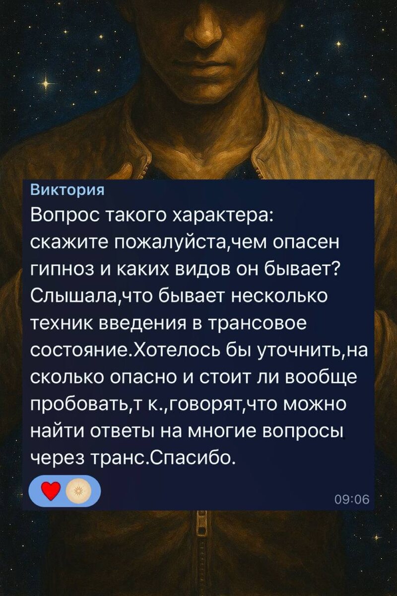 ВОПРОС-ОТВЕТ 🔸Первое, что хочу отметить - безопасность и успех любой практики зависят прежде всего от человека, который её проводит, и от тех духовных сил, которые ему помогают. ➖Действительно есть несколько классификаций гипноза, в зависимости от методов, глубины погружения и целей. Например: Классический, НЛП, Эриксонианский, самогипноз, регрессивный, эзотерический. ➖Транс осуществляющийся через гипноз может быть инструментом для исцеления травм, обнаружения блоков, программирования будущего, но так же есть риски, сосредоточим внимание на них. 🔸Трансовое состояние может быть опасно, так как в этот момент мы становимся уязвимыми и чувствительными. Без крепкой психики, хорошей духовной защиты, находясь в слабой заземленности, мы рискуем навредить себе. Вот основные опасности трансового состояния. ➖Первая опасность заключается в отделении от тела. Люди, у которых слабый контакт с телом, которые неуверенно стоят «на ногах», могут не полностью выйти из транса. В таком состоянии они