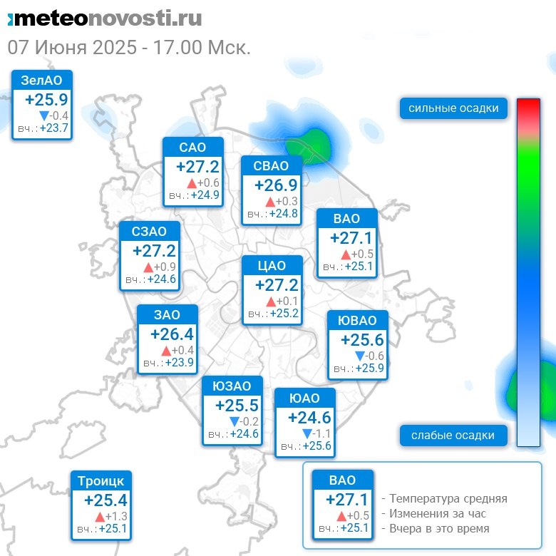В 17:00 в Москве было от +23°C до +28.7°C, средняя температура +26.3°C #погода #Москва #лето #температура #7июня #суббота