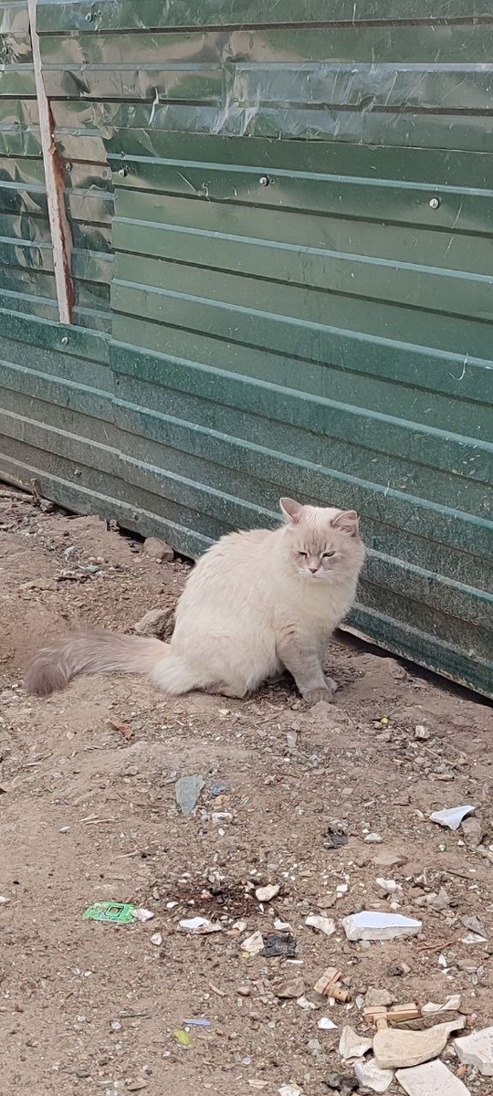 Шерсть уже "не первой свежести", с ошейником. Глазки голубые, возможно один косит.
