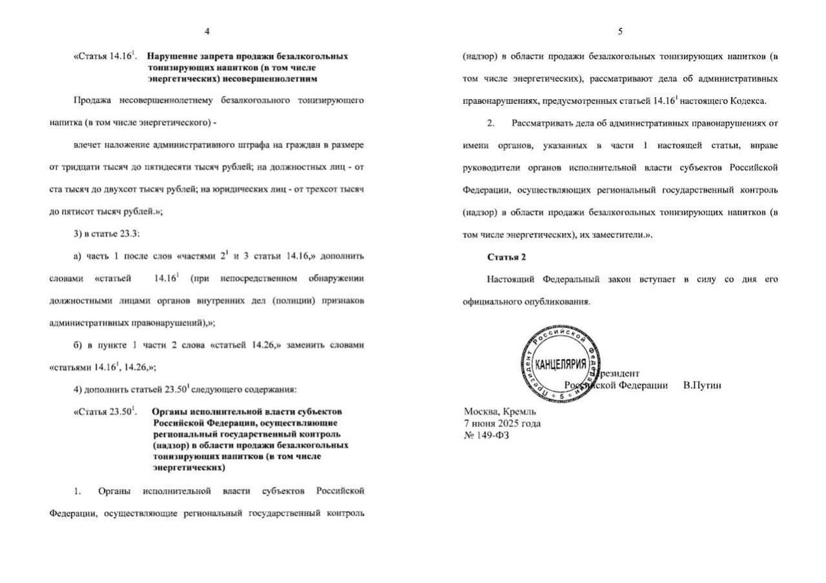 ⚡️Путин подписал закон о введении штрафов до 500 тысяч рублей за продажу энергетиков детям