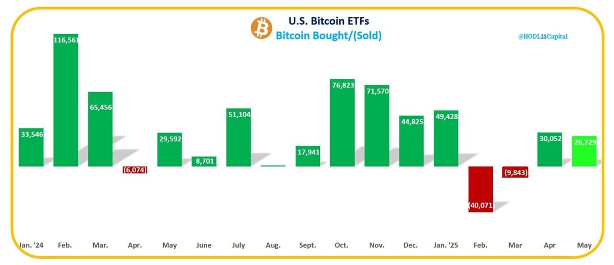 📅 In May 2025, spot Bitcoin ETFs have already added 26,729 BTC to their holdings