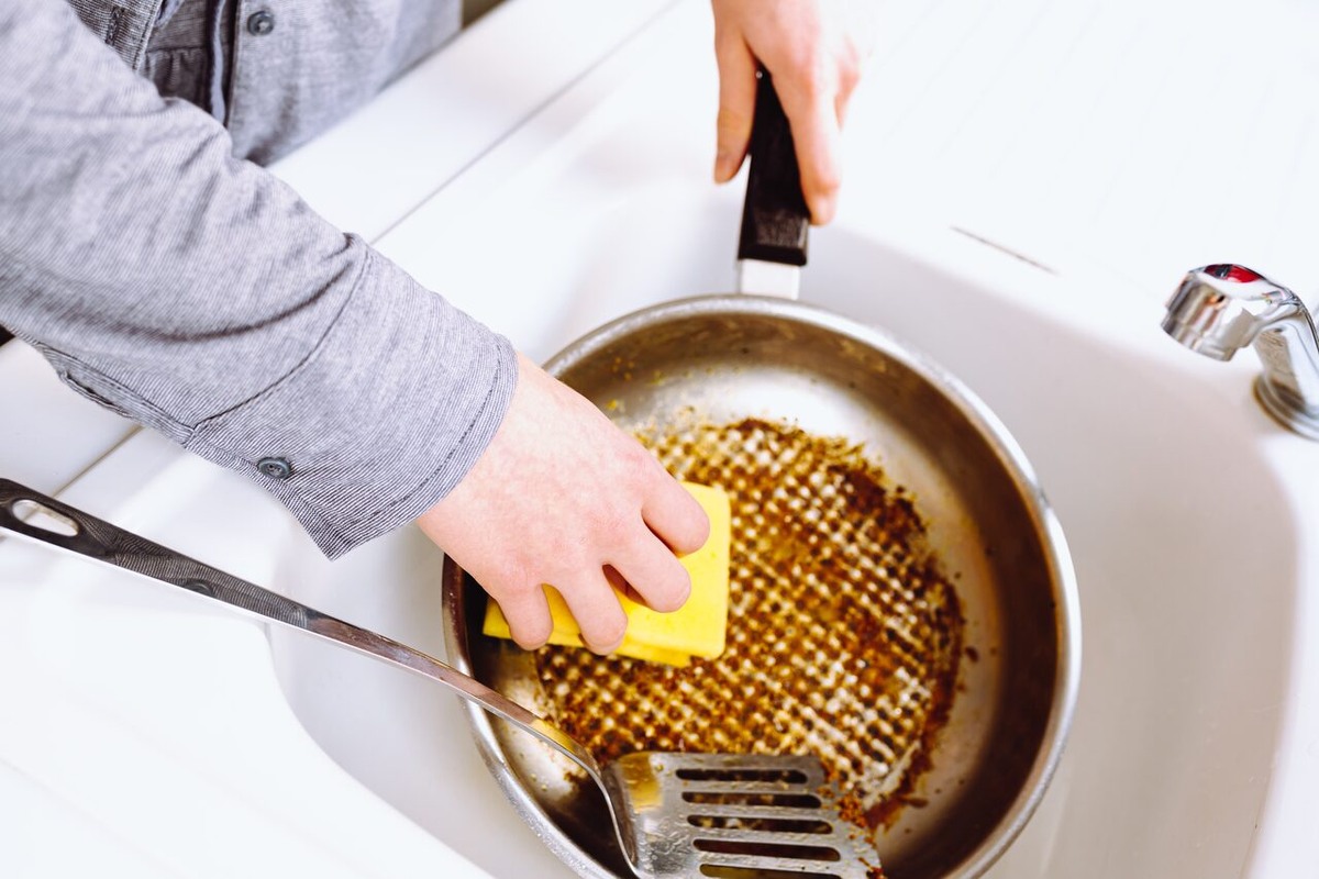 Внешнюю сторону сковородок с антипригарным покрытием можно чистить разными способами, выбирая метод в зависимости от материала. А вот внутреннюю поверхность, из-за ее антипригарных свойств, нужно очищать бережно, используя только мягкие средства.