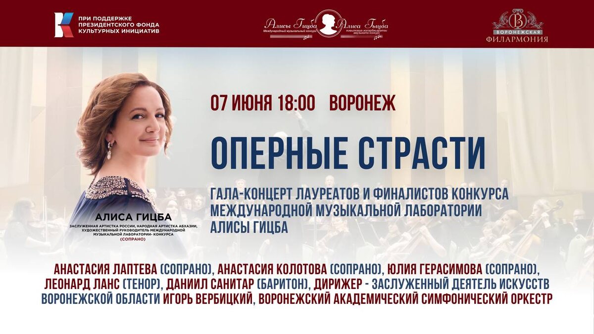 ▶️ Прямо сейчас — в эфире! Трансляция концерта «Оперные страсти» Гала-концерт лауреатов конкурса Международной музыкальной лаборатории Алисы Гицба. 🎶 Звучат великие оперные голоса, на сцене — Воронежский академический симфонический оркестр. 👉 СМОТРЕТЬ СЕЙЧАС ❤️Проект «Международная музыкальная лаборатория Алисы Гицба» проходит при поддержке Президентского фонда культурных инициатив.