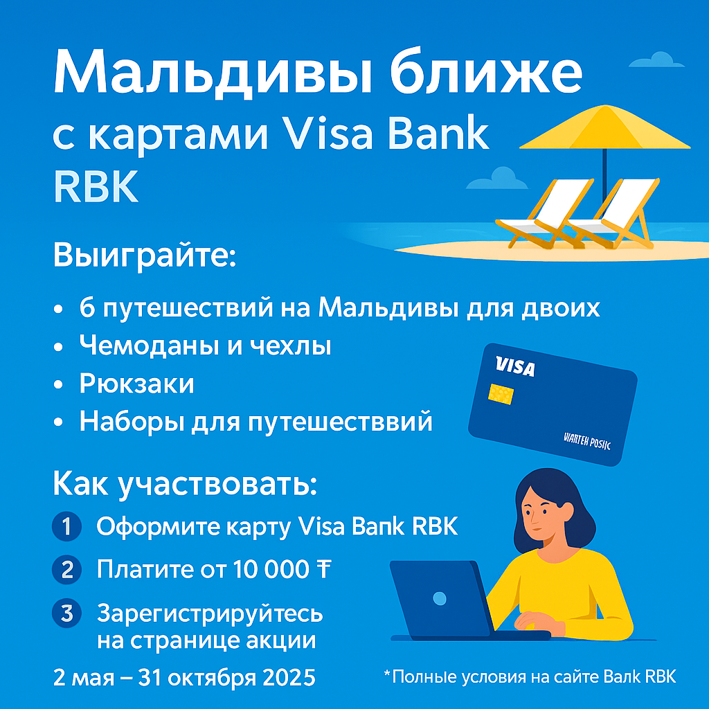 Bank RBK проводит масштабную акцию среди держателей своих карт Visa. Оформите карту, совершайте безналичные покупки и участвуйте в розыгрыше путешествий на Мальдивы и других призов. С 2 мая по 31 октября 2025 года. Розыгрыши проходят ежемесячно — чем раньше участвуете, тем больше шансов. Источник: https://zaimdeneg.kz/akciya-ot-bank-rbk-maldivy-blizhe-s-kartami-visa-bank-rbk/