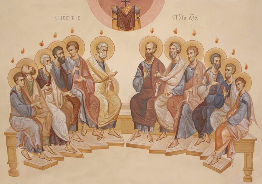 Апостолы, как и повелел им Господь, оставались в Иерусалиме и ждали сошествия Святого Духа, чтобы принять силу для проповеди Евангелия. При наступлении дня Пятидесятницы все они были единодушно вместе. И внезапно сделался шум с неба, как бы от несущегося сильного ветра, и наполнил весь дом, где они находились. И явились им разделяющиеся языки, как бы огненные, и почили по одному на каждом из них. И исполнились все Духа Святого (Деян. 2:1-4).