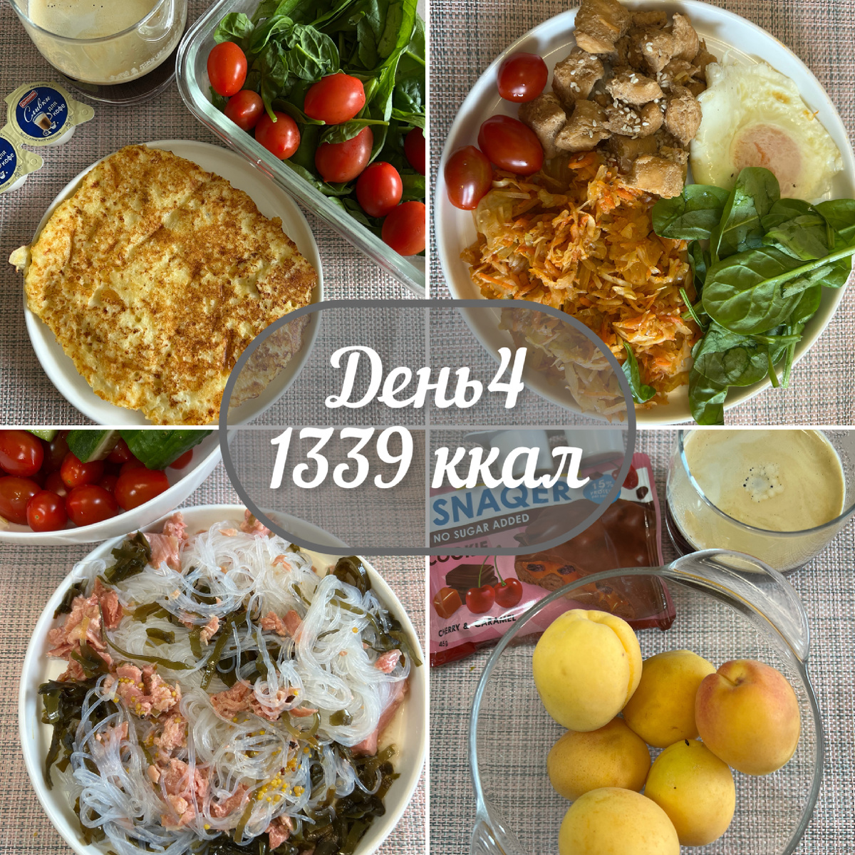 ✅Завтрак Творог - 100 г 2% Яйцо - 1 шт Сыр - 25 г 15% Мука - 10 г Помидоры - 100 г Шпинат - 10 г Масло для обжаривания - 2 г Сливки - 20 г в кофе 10% Соединить творог, яйцо, сыр, специи по вкусу , и муку , смазать сковороду маслом и обжаривать лепешкой с двух сторон. ✅Обед Яйца - 1 шт Масло для обжарки яйца - 2 г Помидоры - 20 г Томатный соус ( у меня из ВВ) - 25 г Капуста с морковкой - 125 г ( свежие белая дача) Масло для капусты - 5 г Кунжут - 3 г Курицу готовлю на 2 порции : Куриное филе - 260 г Соевый соус - 30 г Масло оливковое - 6 г Капусту с морковкой обжарить на масле, посолить поперчить , добавить соус и протушить 5 минут Курицу обжарить 5 минут на масле , посолить , добавить соевый соус и потушить до готовности, разделить на две порции, одну оставить на завтрашний обед ✅ужин Помидоры - 30 г Огурцы - 100 г Горчица - 10 г Фунчоза - 50 г ( в сухом виде) Капуста морская - 50 г Тунец - 70 г конс в с/с Фунчозу залить кипятком на 5 минут, слить воду , смешать с т