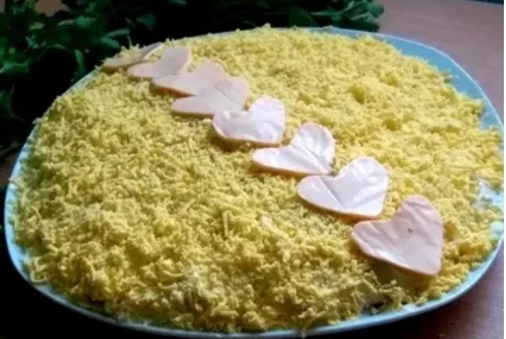 Яйца отвариваем, охлажаем, очищаем и отделяем белки от желтков. Белки, желтки и плавленые сырки поочерёдно натираем на средней тёрке в разную посуду. Тунец вместе с маслом выкладываем в глубокую чашку и разминаем вилкой. Лук очень мелко нарезаем. Белки - плавленые сырки - половину банки тунца - майонез - лук - тунец вторая половина - майонез - желтки. Украшаем по желанию. Можно вырезать формочки из плавленого или любого другого сыра, всё это по Вашему желанию. Всем мира, добра, красоты!