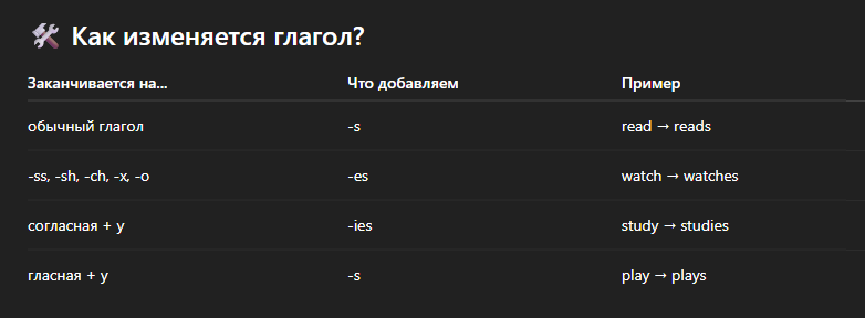 В нём почти нет склонений, спряжений и изменений формы слова. Поэтому -s в 3-м лице — это единственный способ показать, кто делает действие. Это не “прихоть”, а способ обозначить, что речь идёт об он/она/оно.
