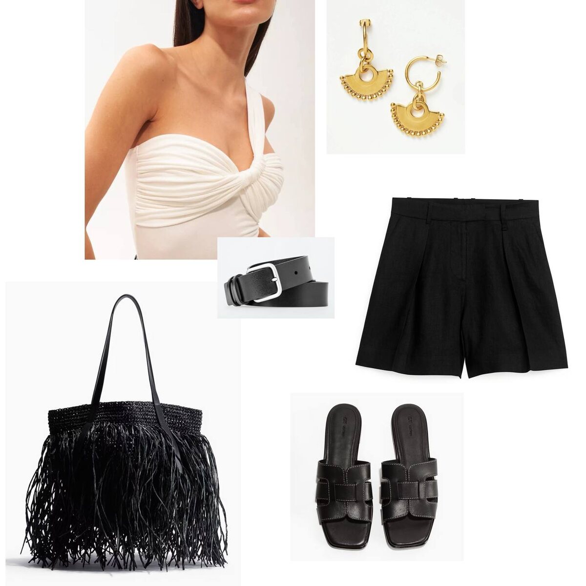 – Акценты в аксессуарах: плетёная сумка с бахромой, кожаные сандалии, ремень с пряжкой и акцентные серьги.