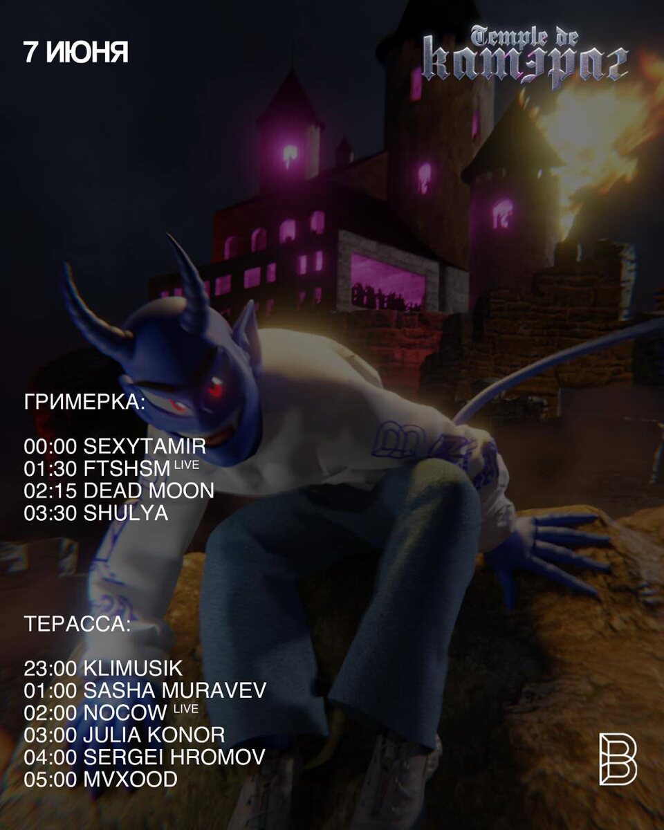 7.06 — Temple de Катэраг Кутеж на два направления — мрачная и грубая гримерка & дерзкая и яркая терраса 🌪️ Несемся до самого утра не сбавляя обороты! 🎫Предпродажа билетов до 21:00 📆 7 июня, в 23:00