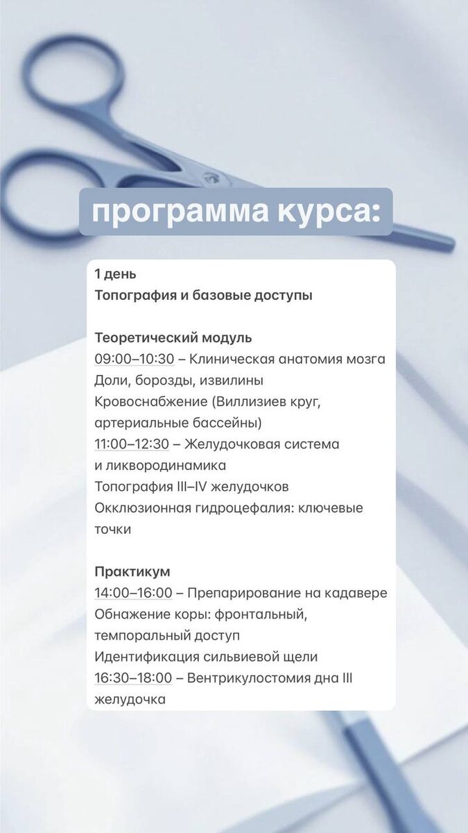 🧠 Как уверенно ориентироваться в мозге, когда на кону — чья-то жизнь? Когда вы стоите у операционного стола, нет времени на ошибки. Топография борозд, сосудов, желудочков — это не просто анатомия из учебника. Это ваша навигация во время самых тонких операций 📍На кадавер-курсе «Хирургическая анатомия головного мозга: от основ до сложных доступов» вы не просто повторите базу Вы отработаете доступы, которые спасают жизни: — Вентрикулостомия III желудочка — Диссекция средней мозговой артерии — Транссфеноидальный доступ к гипофизу — Эндоскопическая вентрикулоцистерностомия 🎯 70% практики. Мини-группы. Реальные инструменты. Здесь теория превращается в осязаемый навык 📆 26–27 июля, Санкт-Петербург Регистрация уже открыта — количество мест ограничено. Узнать подробности и записаться на курс — тут