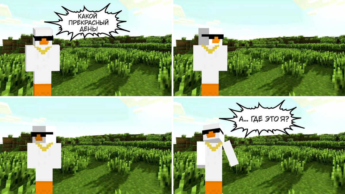 Пришло время открыть вам тайну. Я уже очень давно пытаюсь создавать простенькие комиксы, но я не художник, а найти свой стиль, не обладая художественными навыками, довольно тяжело. Поэтому я решил попробовать сотворить что-нибудь забавное со своим скином из Minecraft. Так мой гусь впервые оказался в комиксе :) И не успел он понять, что происходит, как его... ...нагло разыграли! Но ведь не убили, и то хорошо) Однако на этом история только началась. В комиксе явно творилось что-то неладное. Гусь услышал какой-то странный звук... Голос был настолько громкий, что казалось, будто в мире началась гроза. О да, как давно я ждал этого момента! Я на Дзене с 2022 года и это мой первый комикс — как тут не вмешаться в ход событий?) Стоит ли доверять этому странному голосу? Кстати, герои комикса даже не подозревают, что их нарисовал тоже гусь. Или подозревают? Выбор за вами. Наступает ночь и бездействие может плохо закончиться! Опрос как всегда встраивается по дурацки, но иначе никак 😅 Пилить про