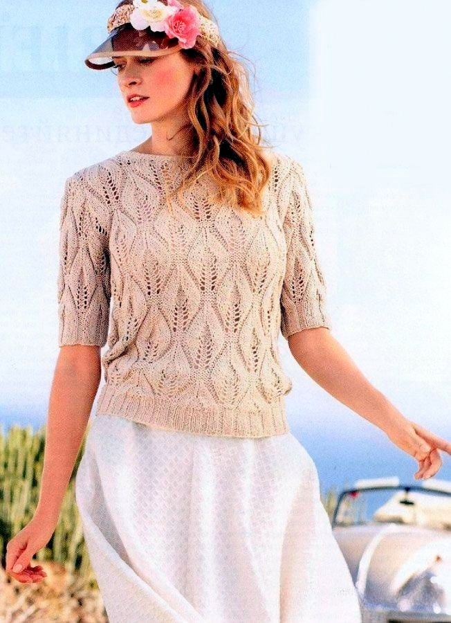 Кремово-бежевый пуловер с крупным лиственным узором и короткими рукавами ♥