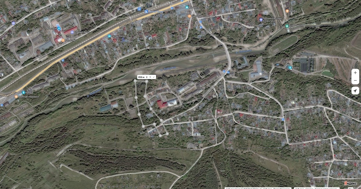 ГЭС "Белый Уголь" (в честь которой и был назван посёлок на окраине Ессентуков") была одной из самых первых ГЭС на территории тогда ещё Российской Империи. И начать надо с того, где она находится. На популярных в России "Яндекс-картах" её не найти. Ориентиром для Вас должен быть адрес: Ессентуки, Белоугольная улица, 20А. Там находится машзал. А вообще без учёта длинного канала, который подводил воду к ГЭС, территория, связанная с ней, вот такая, как на картинке. Почему столь странная траектория - поймёте по ходу репортажа.