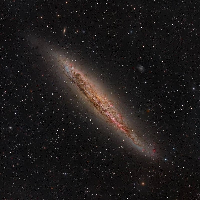 Галактика NGC 4945: космический сосед с бурной жизнью Всего в 13 миллионах световых лет от нас, в созвездии Центавра, расположилась спиральная галактика NGC 4945. Похожая по размерам на наш Млечный Путь, она предстает перед нами ребром, демонстрируя свой тонкий звездный диск. Что делает ее особенной: - Плотный пылевой диск, создающий эффект "ряби" на фоне звезд - Ярко-розовые облака (водородные области H-альфа) - зоны активного звездообразования - Сверхмассивная черная дыра в центре, активно поглощающая материю (галактика относится к типу Сейферта) - Искривленные внешние рукава - следы прошлых галактических взаимодействий - Контраст цветов: золотистое ядро (старые звезды) и голубые спиральные рукава (молодые звезды) Этот снимок получен с использованием фильтров LRGB и H-альфа на телескопе Planewave CDK 1000 в обсерватории Эль-Соус (Чили). Фото и обработка: Mike Selby #астрофотография #галактика #космос #астрономия