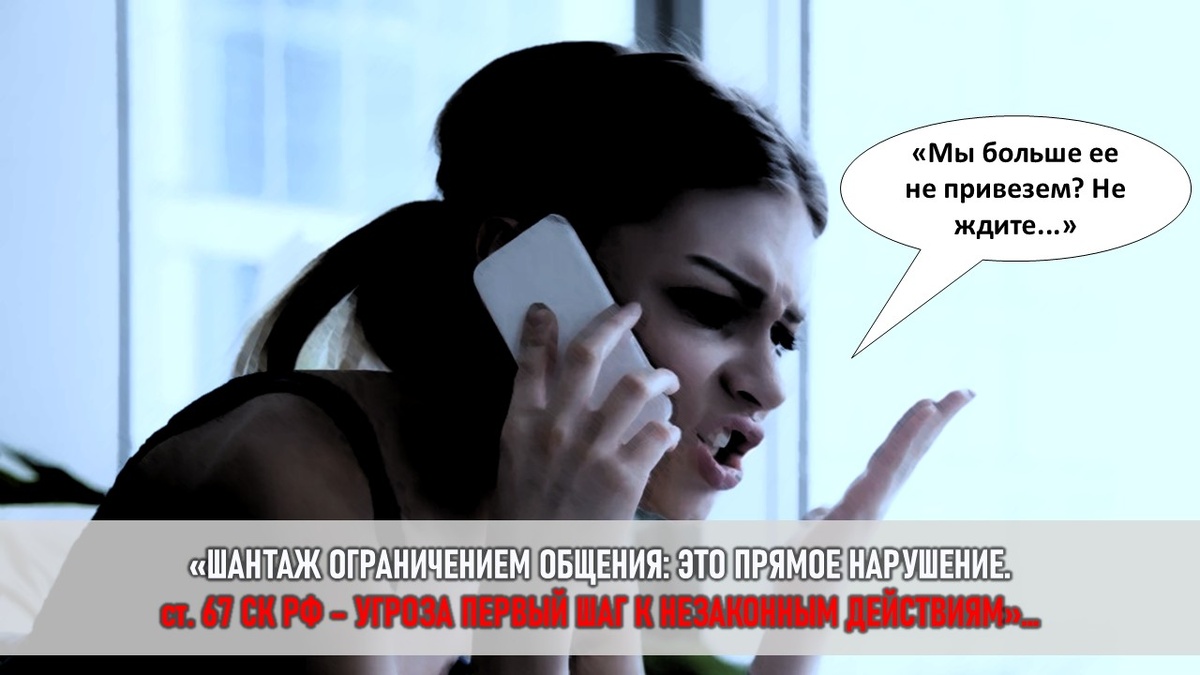 Шантаж ограничением общения: Это прямое нарушение ст. 67 СК РФ. Угроза ("Больше не привезем") – первый шаг к незаконным действиям.