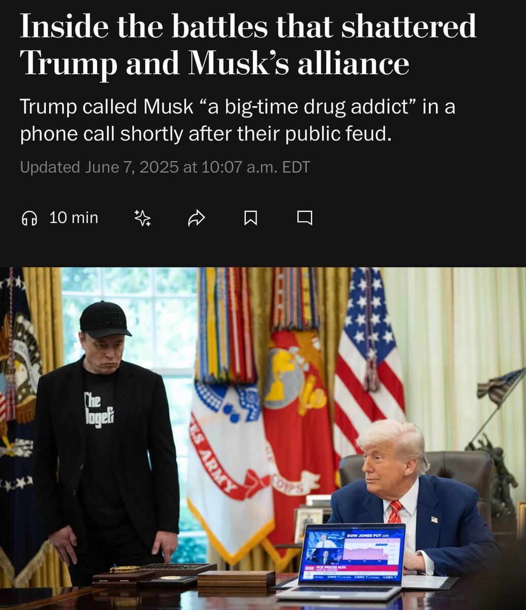 Трамп назвал Маска «наркоманом с большой буквы» вскоре после их ссоры, — The Washington Post. По данным издания, представители Белого дома заявили, что обеспокоенность Трампа по поводу употребления Маском наркотиков, отчасти возникшая на основе сообщений в СМИ, стала одним из факторов разрыва их отношений.